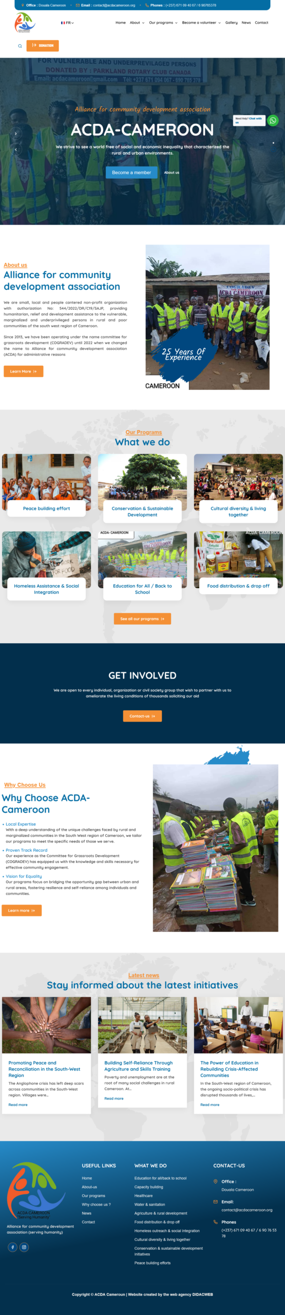 Didacweb a donc conçu une plateforme moderne et accessible, mettant en valeur les initiatives d’ACDA Cameroon et facilitant la prise de contact. Ce nouveau site renforce la crédibilité de l’organisation et soutient sa mission d’aider les communautés les plus vulnérables.