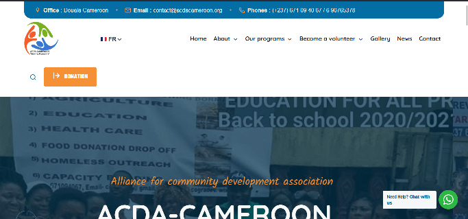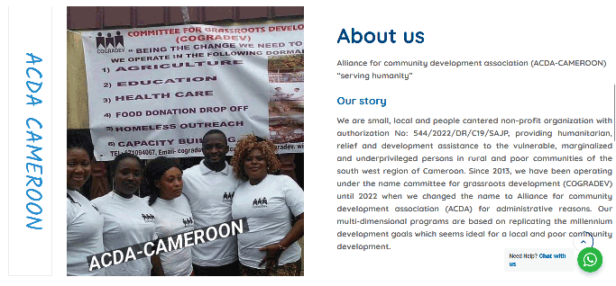 Avant sa collaboration avec Didacweb, ACDA Cameroon, une organisation locale à but non lucratif, souhaitait améliorer sa visibilité en ligne afin de mieux présenter ses actions humanitaires auprès des communautés vulnérables du Sud-Ouest du Cameroun. Autorisée sous le numéro 544/2022/DR/C19/SAJP, l’organisation apporte assistance, secours et appui au développement aux personnes marginalisées et défavorisées.