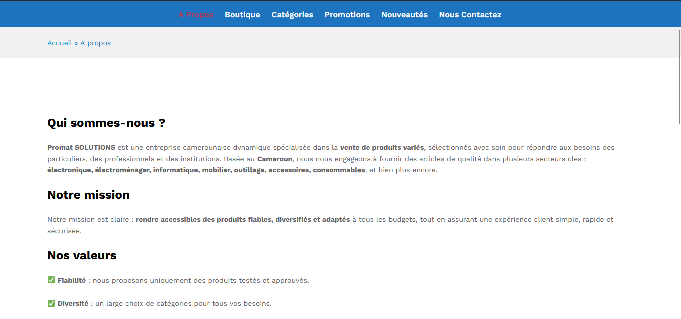 Avant sa collaboration avec Didacweb, Promate Solutions souhaitait moderniser sa présence en ligne et mieux mettre en valeur la diversité de ses produits destinés aussi bien aux particuliers qu’aux professionnels et institutions. L’objectif était de présenter clairement son offre multisectorielle — électronique, électroménager, informatique, mobilier, outillage, accessoires et consommables — tout en renforçant la confiance autour de la qualité de ses articles.